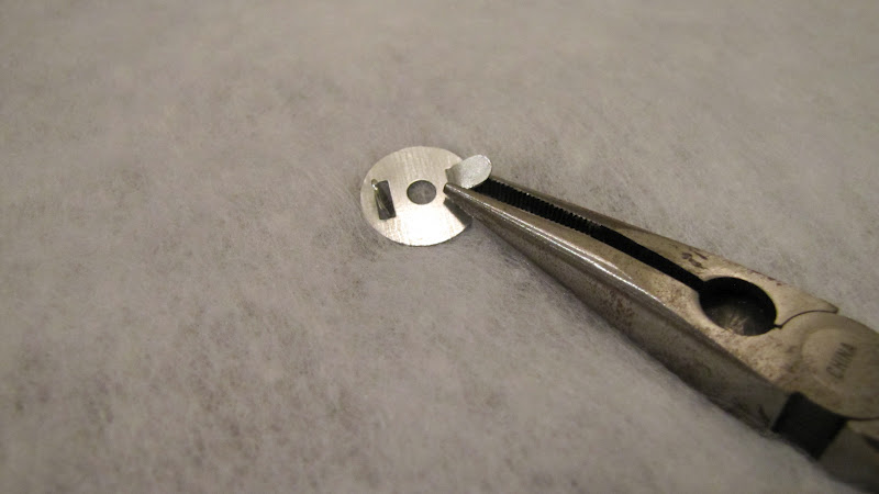 I just kind of eyeballed where the middle of the fabric is. I pushed the prongs onto the fabric so it would make a bit of a mark and then cut a slit with scissors in the fabric so I could slide the prongs through. I then also included a thin piece of cardboard underneath it for a bit of extra support. You then use needle-nose pliers to bend the prongs down so it will stay secure onto the fabric.